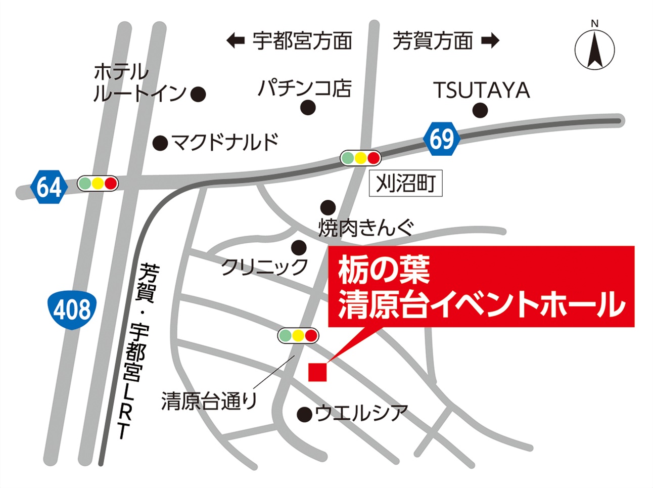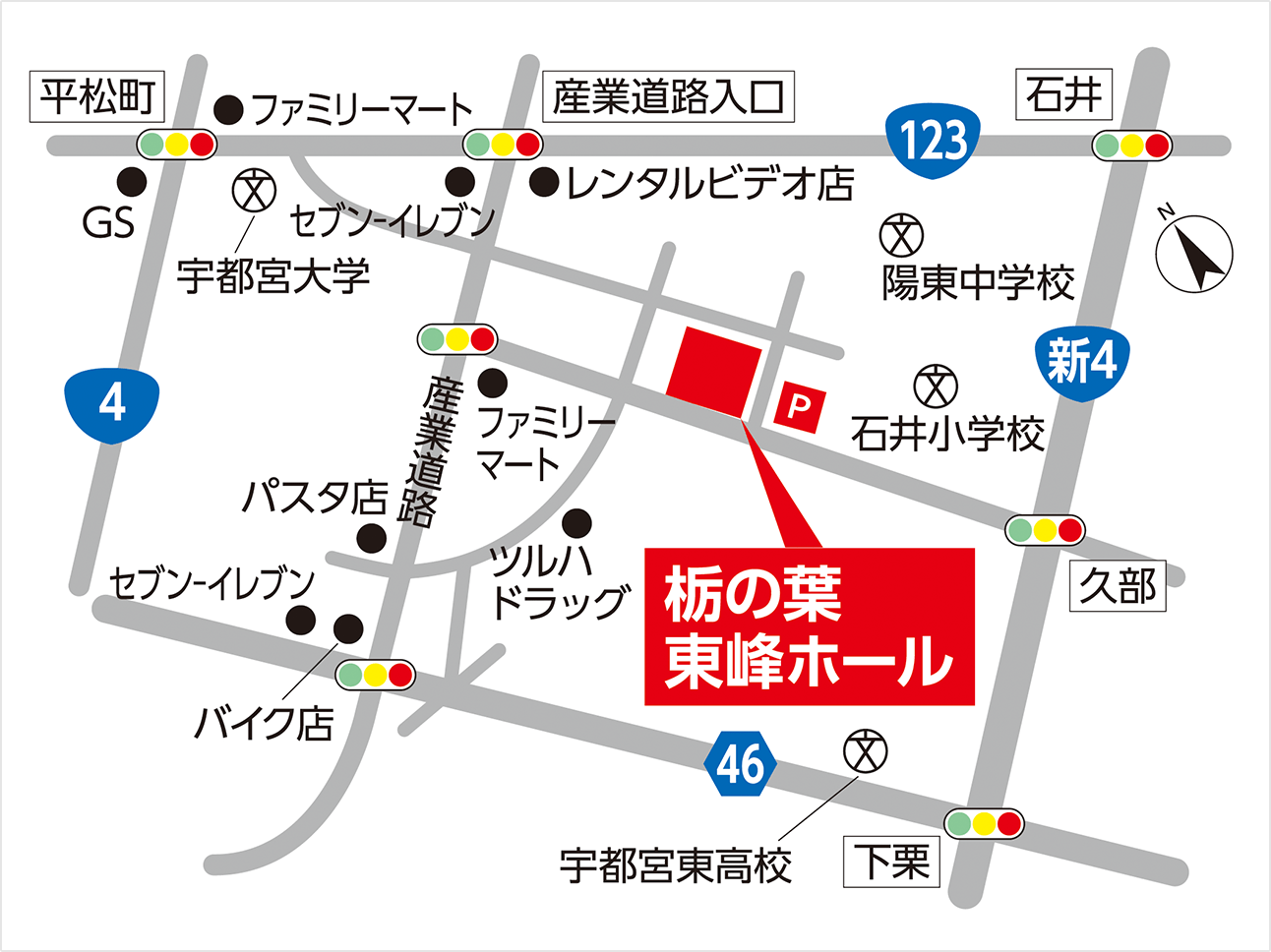 都賀JCより北関東自動車道へ上三川ICより新4号北へ6km、久部交差点西へ1km